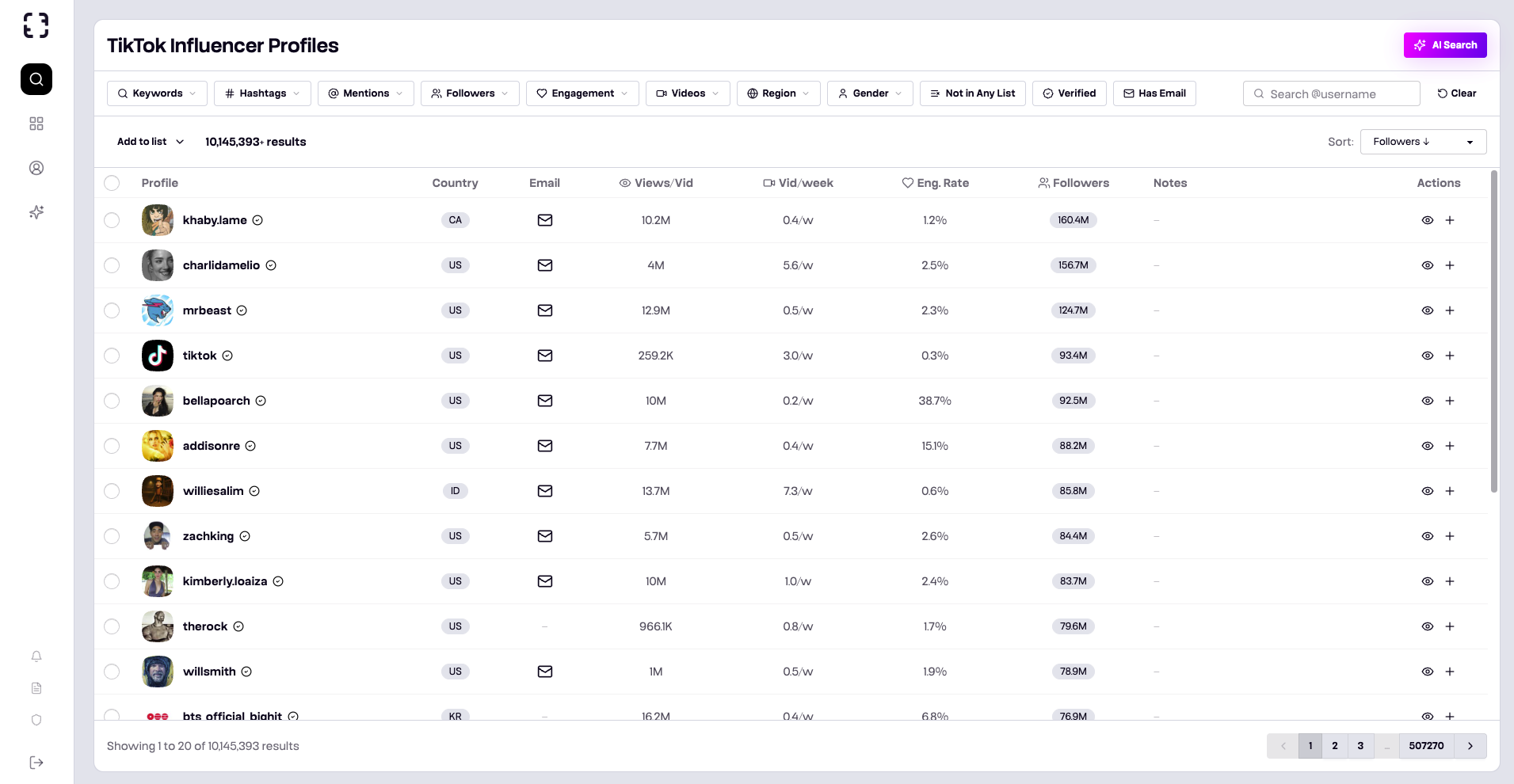 Only quality creators — from 250M+ profiles analyzed, we've filtered down to 10M that actually matter: real engagement, real audiences, real results.